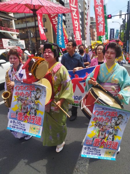 台東区など東京東部地域の労働組合や業者でつくる実行委員会が9月10日に行った「インボイス導入やめろ! 雷大行進」。約800人が参加して観光客でにぎわう浅草をデモ行進しました。同実行委は「インボイス制度は、免税業者への課税と、困窮事業者を廃業の危機に追い込むもの」と批判し、導入の中止・延期を要求しました。チンドン屋さんを先頭にした、にぎやかなアピールは道行く人々からも注目されました。