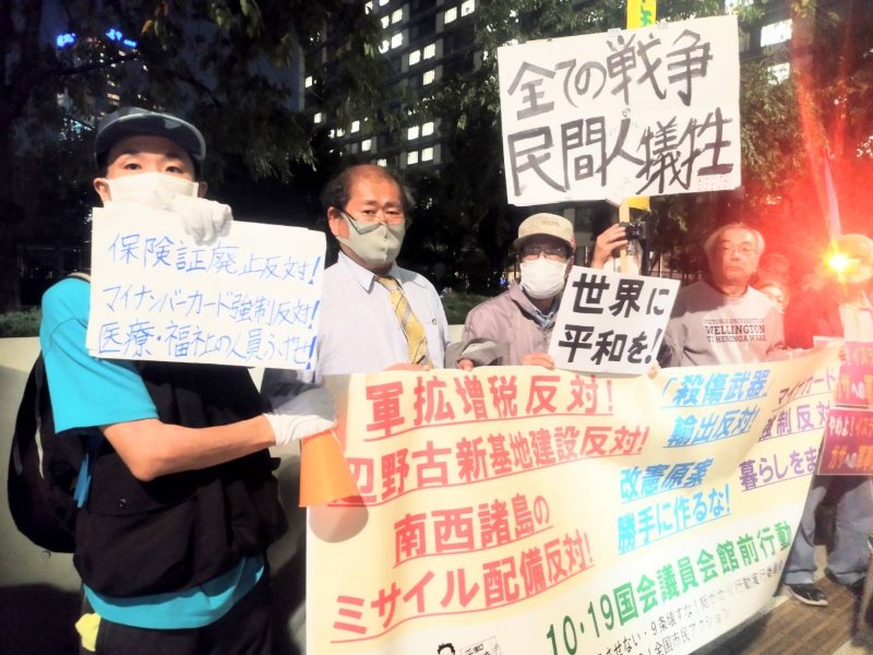 暮らしより軍事にお金をつぎ込む岸田政権の暴走をとめようと、10月19日、国会前行動が取り組まれました。総がかり行動実行委員会などが主催し、約900人が参加しました。立憲民主党、日本共産党、社民党、沖縄の風の国会議員らが、沖縄・辺野古新基地建設をめぐる代執行訴訟で頑張る玉城デニー知事を支持し、沖縄・南西諸島の軍備拡大を進める岸田政権を厳しく批判。パレスチナのガザにイスラエルが「報復攻撃」を続けている問題についても「暴力の連鎖で事態は変えられない」とアピールしました。