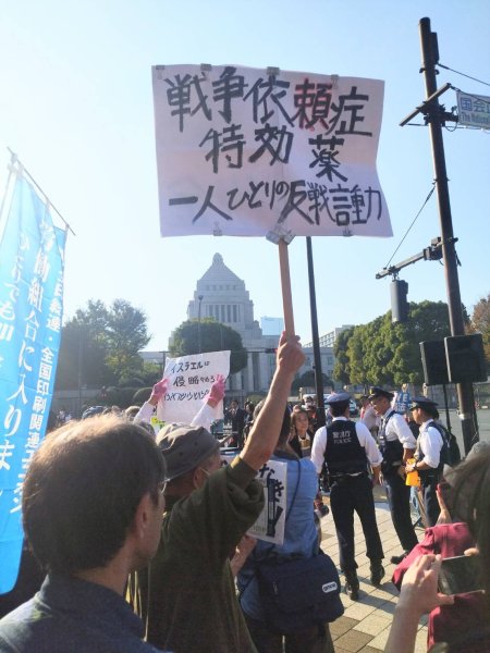 大軍拡阻止、イスラエルのガザ攻撃中止を/国会前で憲法行動/エジプト人親子も訴え