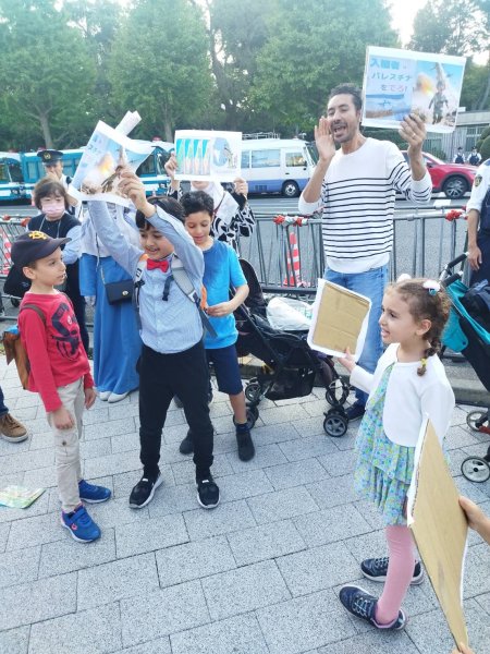 行動が終了したあと、正門前では在日エジプト人の親子ら10数人が「子どもを殺すな」「ガザを解放しろ」とアピール。子どもたちも「入植者はパレスチナをでろ!」などと書かれたプラカードを掲げました。大人の一人は「街頭に出て訴えるのは今回が初めて」と話していました。