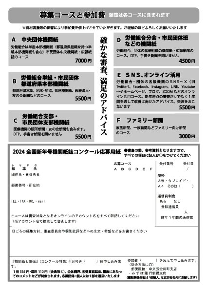 2024年新年号(1月号)の機関紙を発行している民主団体・労働組合、個人(家族)の皆様を対象に機関紙コンクールを開催いたします。応募要項についてはご案内の一番最後にあるPDFをご覧ください。皆様のご応募をお待ちしております。(※画像をクリックするとチラシPDFを閲覧・印刷できます)