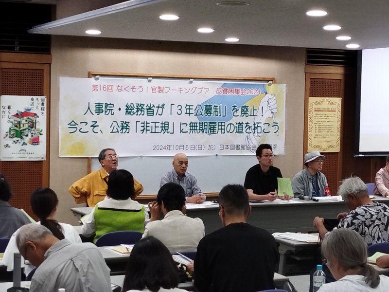3年公募の廃止状況について報告があった官製ワーキングプア集会=10月6日都内で