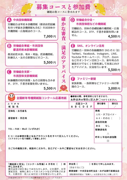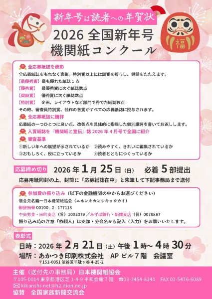 2026全国新年号機関紙コンクール開催のお知らせ 2025年12月9日 最終更新日時 : 2025年12月9日 日本機関紙協会 2026全国新年号機関紙コンクールを来年も開催いたします。詳細は下記をご覧ください。みなさまのご応募をお待ちしております。 ※画像をクリックすると、PDFを開くことができます。 FacebookXBlueskyCopy